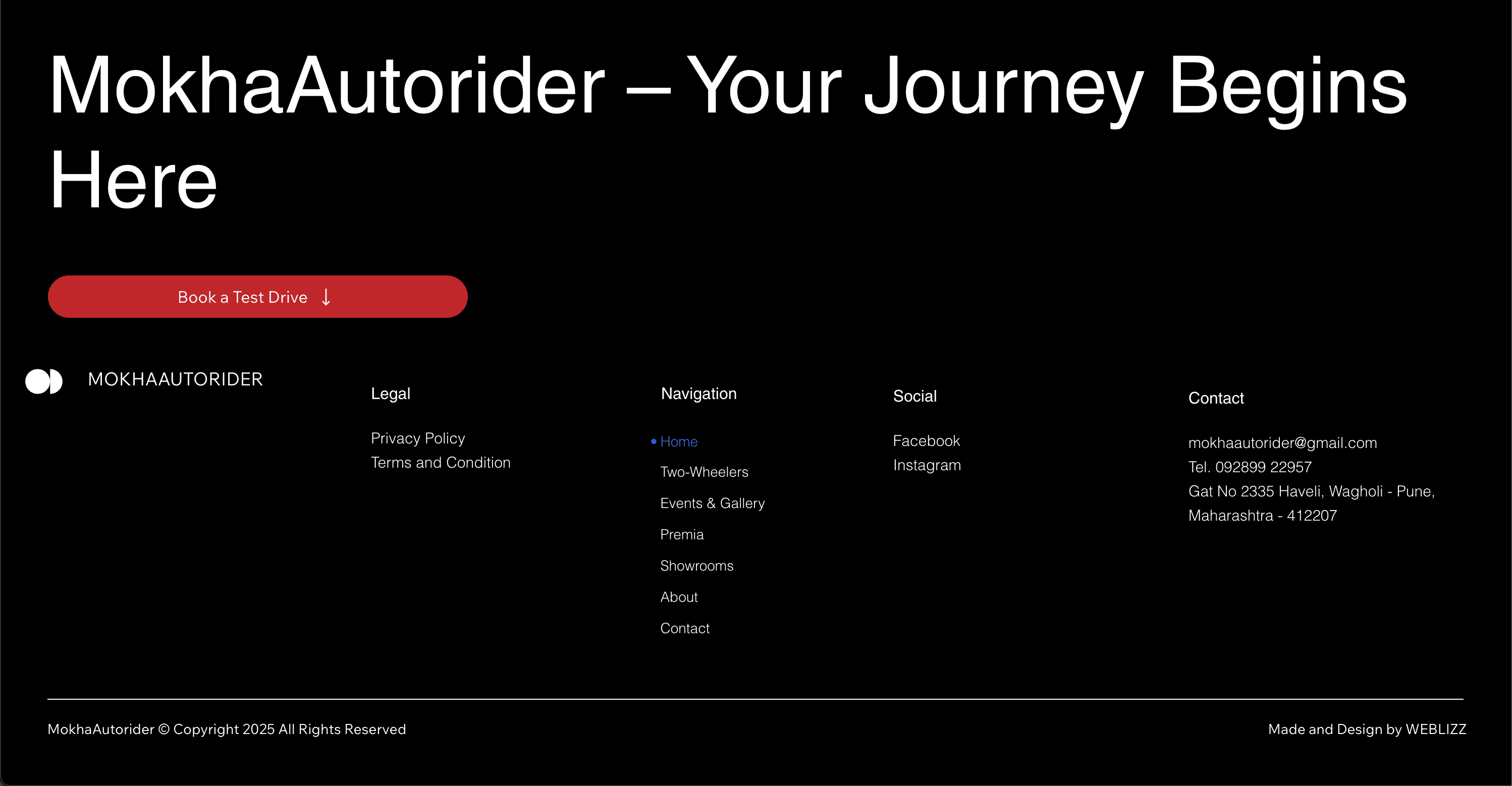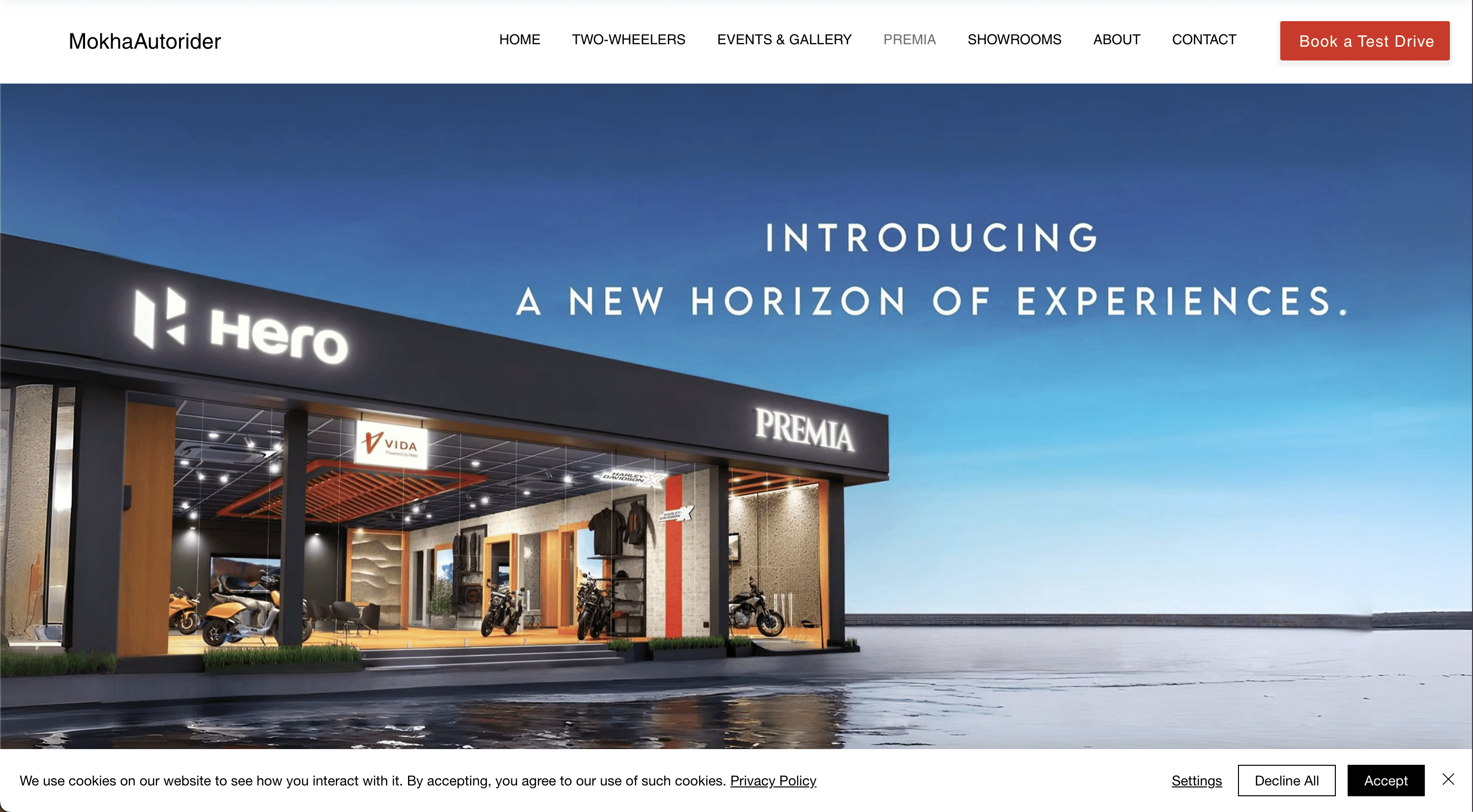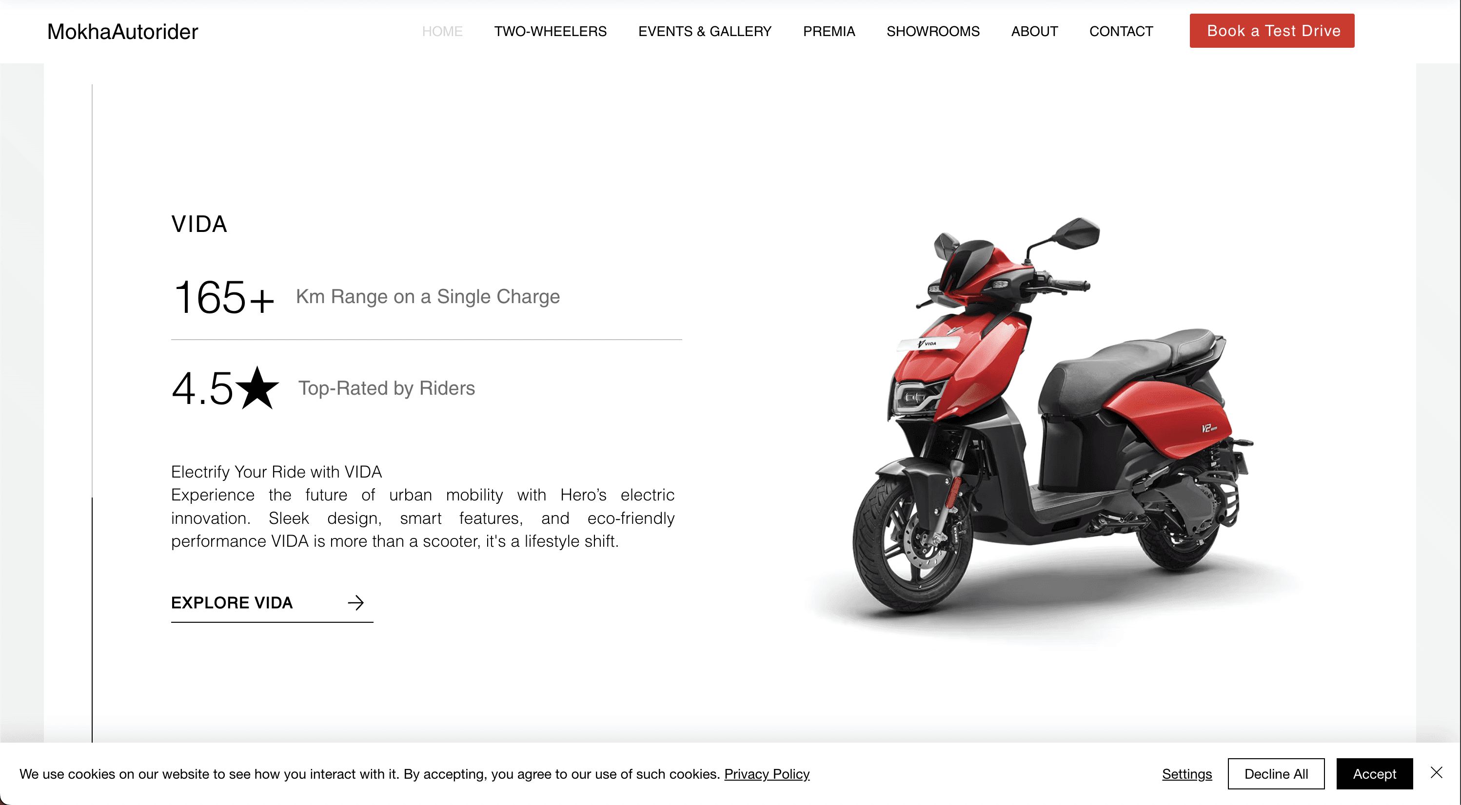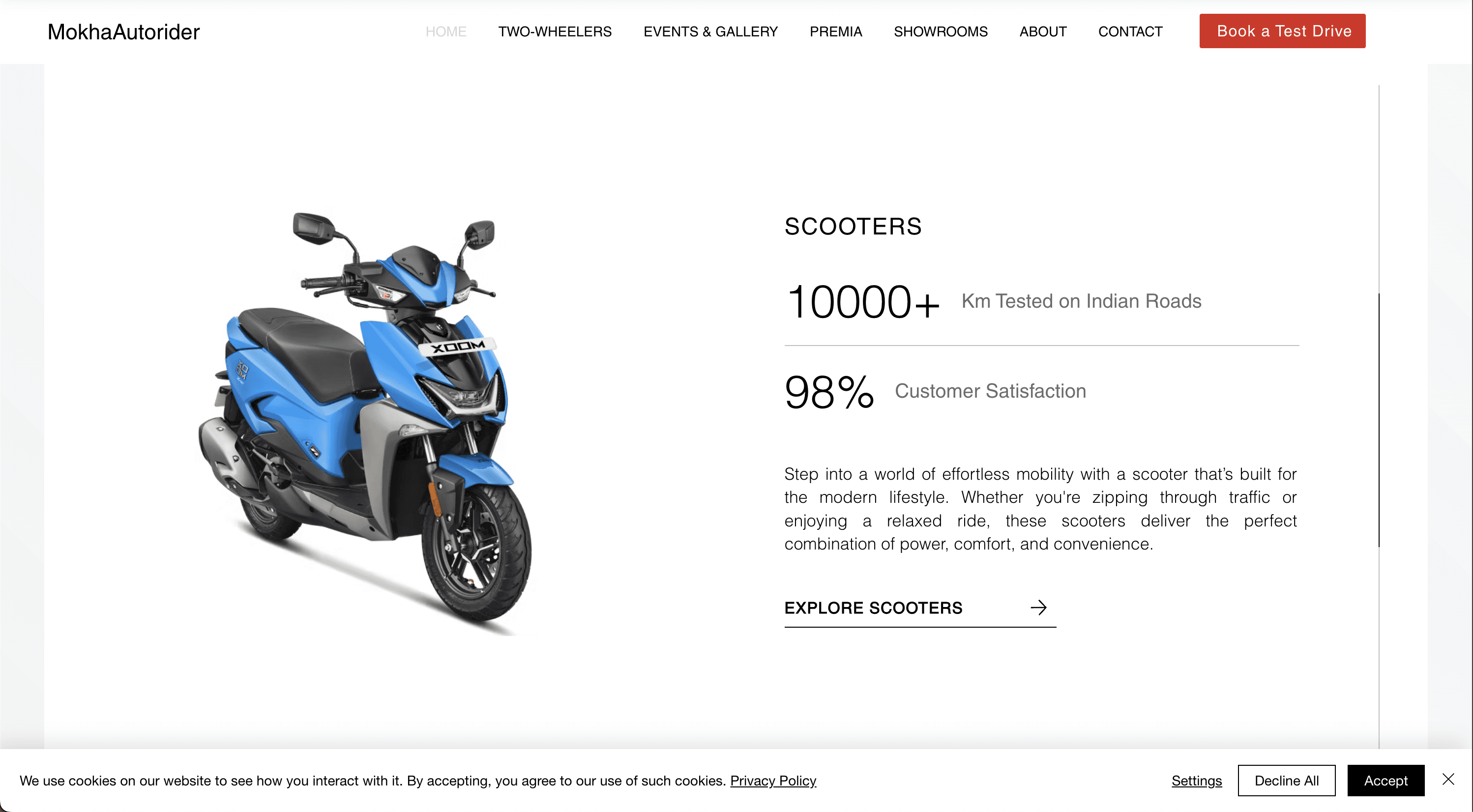 The Hero Mokha Autorider website showcases a sleek and dynamic design that highlights the full range of Hero two-wheelers across all five showroom locations. With a user-friendly interface, responsive layout, and easy access to product details, offers, and contact information, the site delivers a smooth and engaging browsing experience for bike enthusiasts and buyers.
